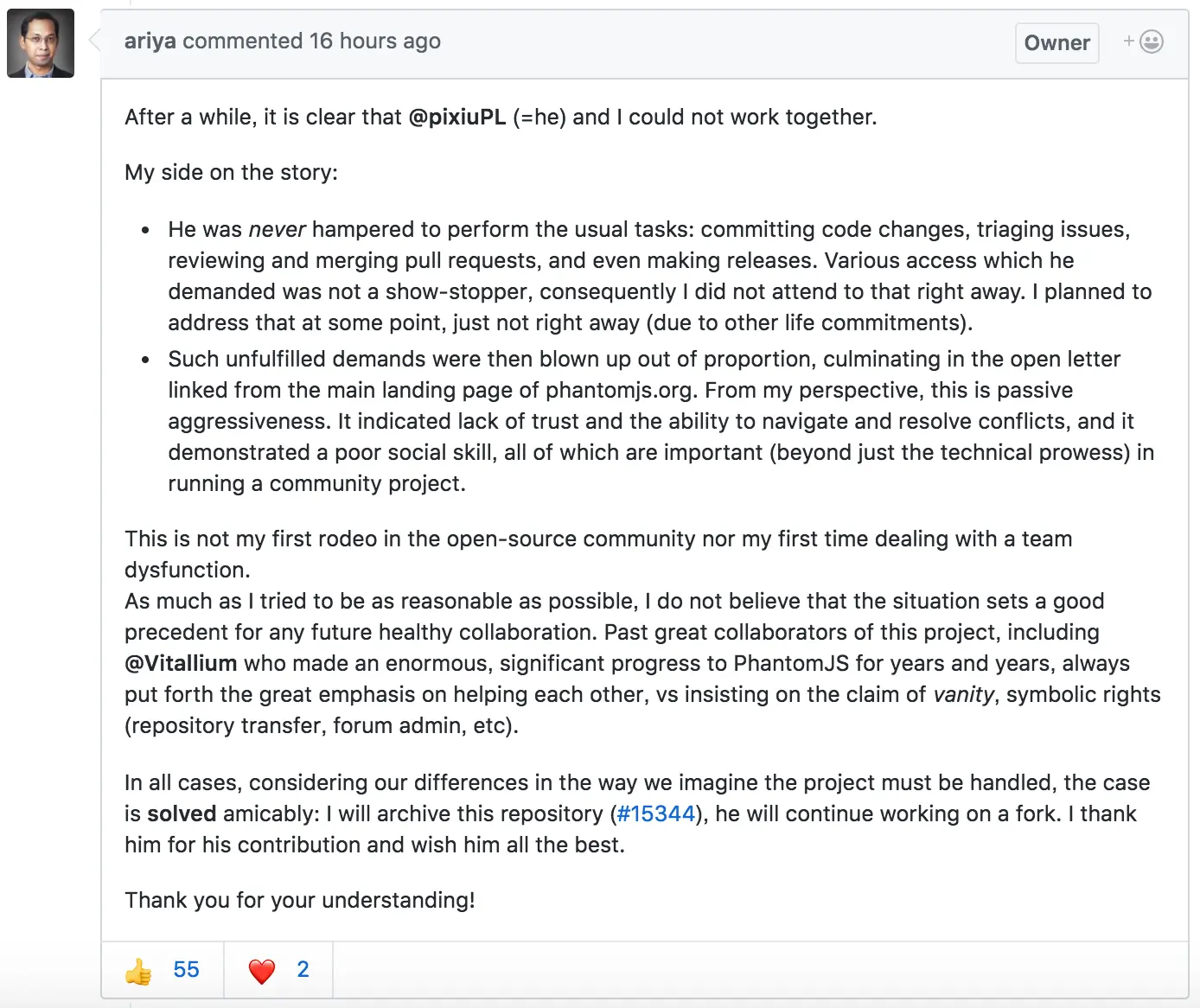在公开信发布后的 3 月 4 日,pixiuPL 补充道,ariya 已通过 Skype 回复了他,但对于他接管项目的建议感到不愉快。ariya 似乎更愿意关闭项目,并批评 pixiuPL 创建了 PJS 的内部分支(在 GitHub 之外)。