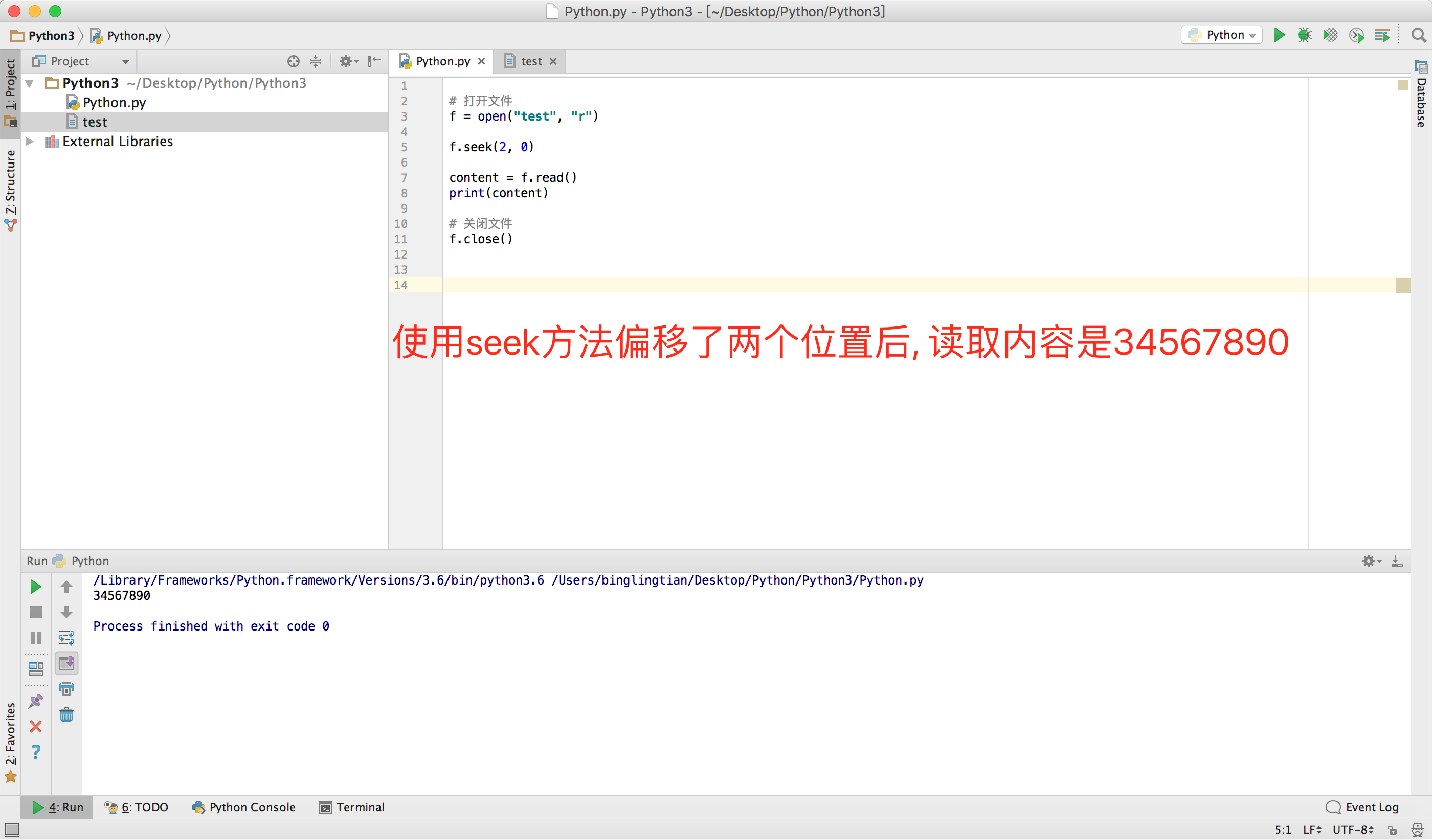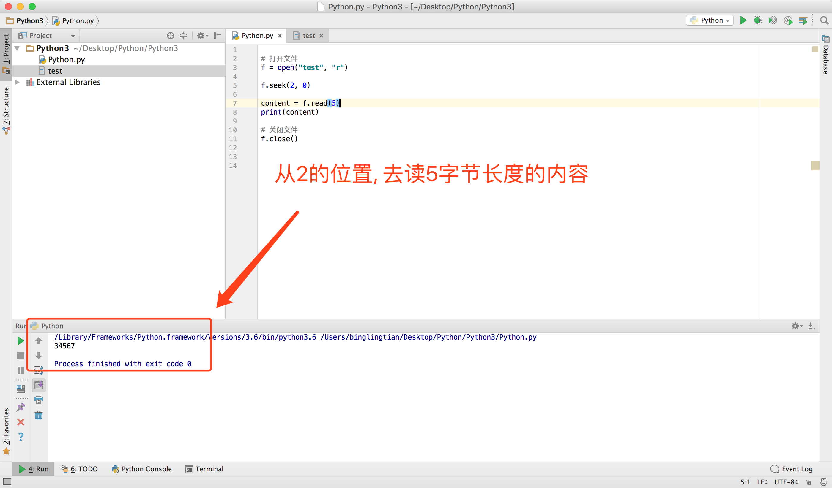 seek(2, 0)移动文件句柄位置, 在读取5个字节长度的数据, 打印:34567