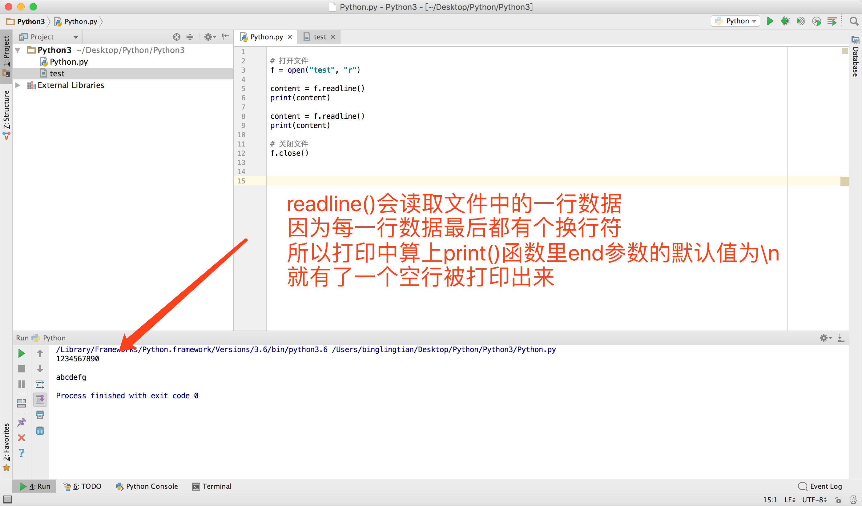 readline()读取数据, 可以看到两行打印(实际还有一行\n), 每一行后面的换行符\n和print()中end的默认值\n都被打印