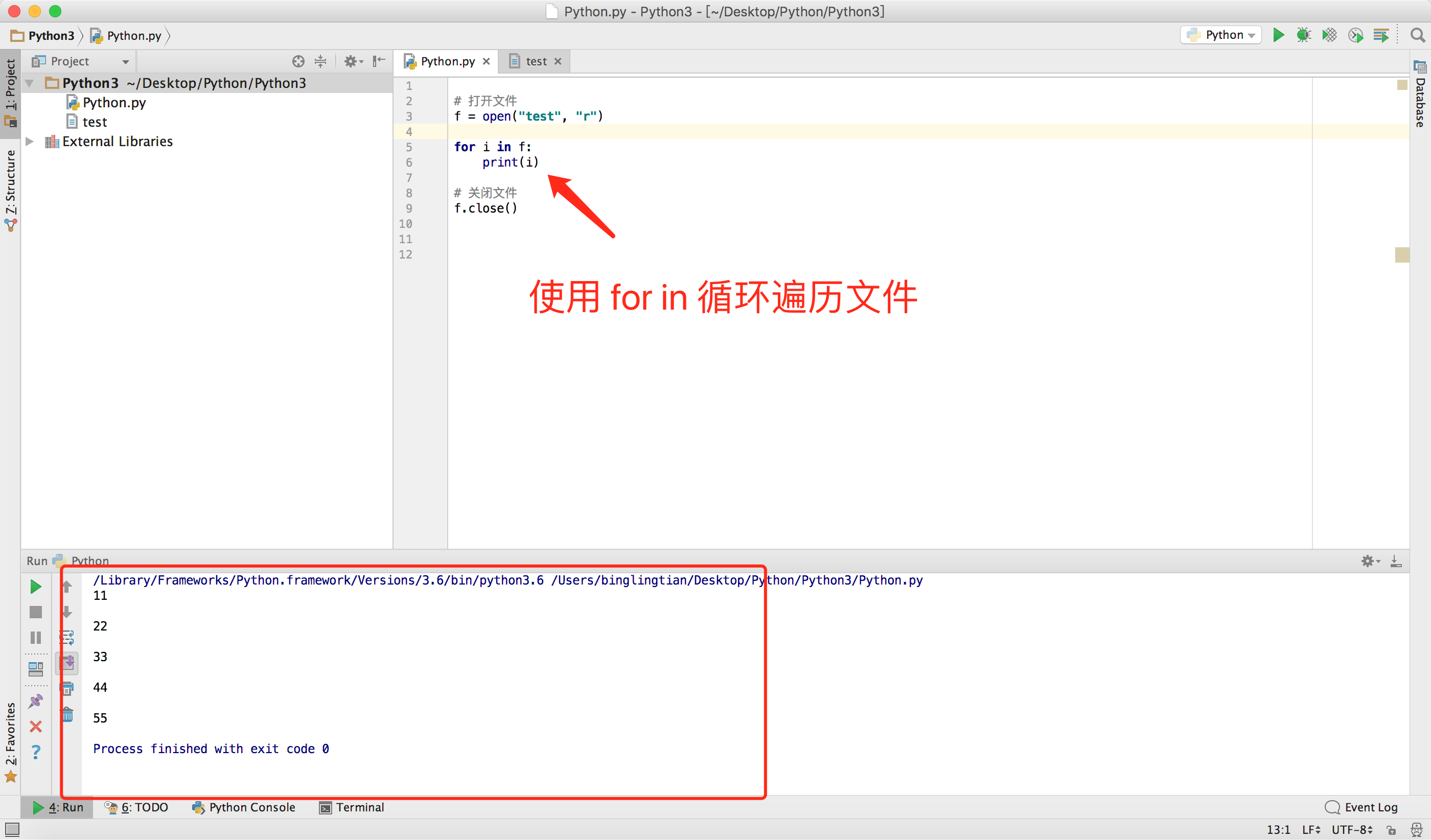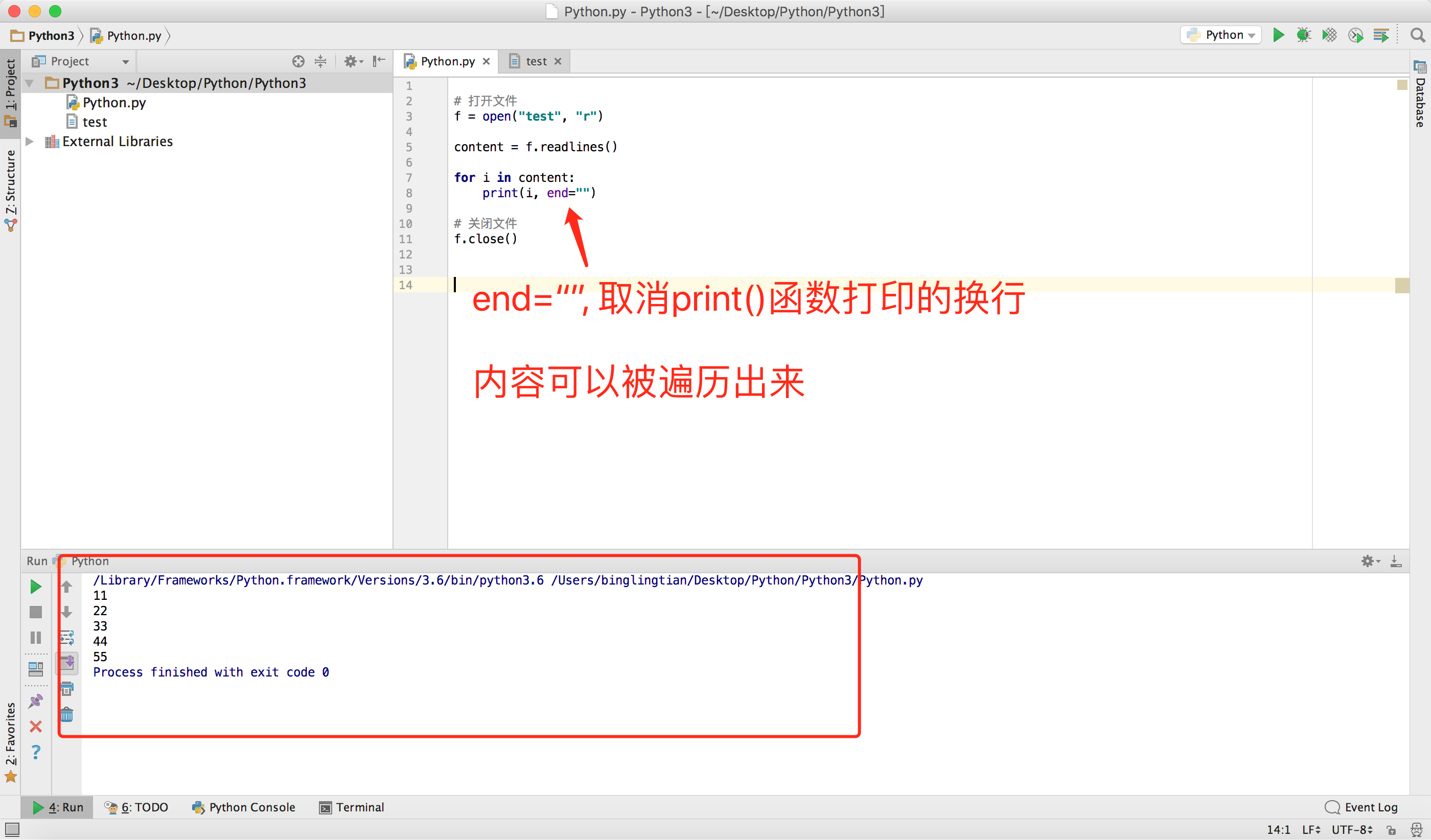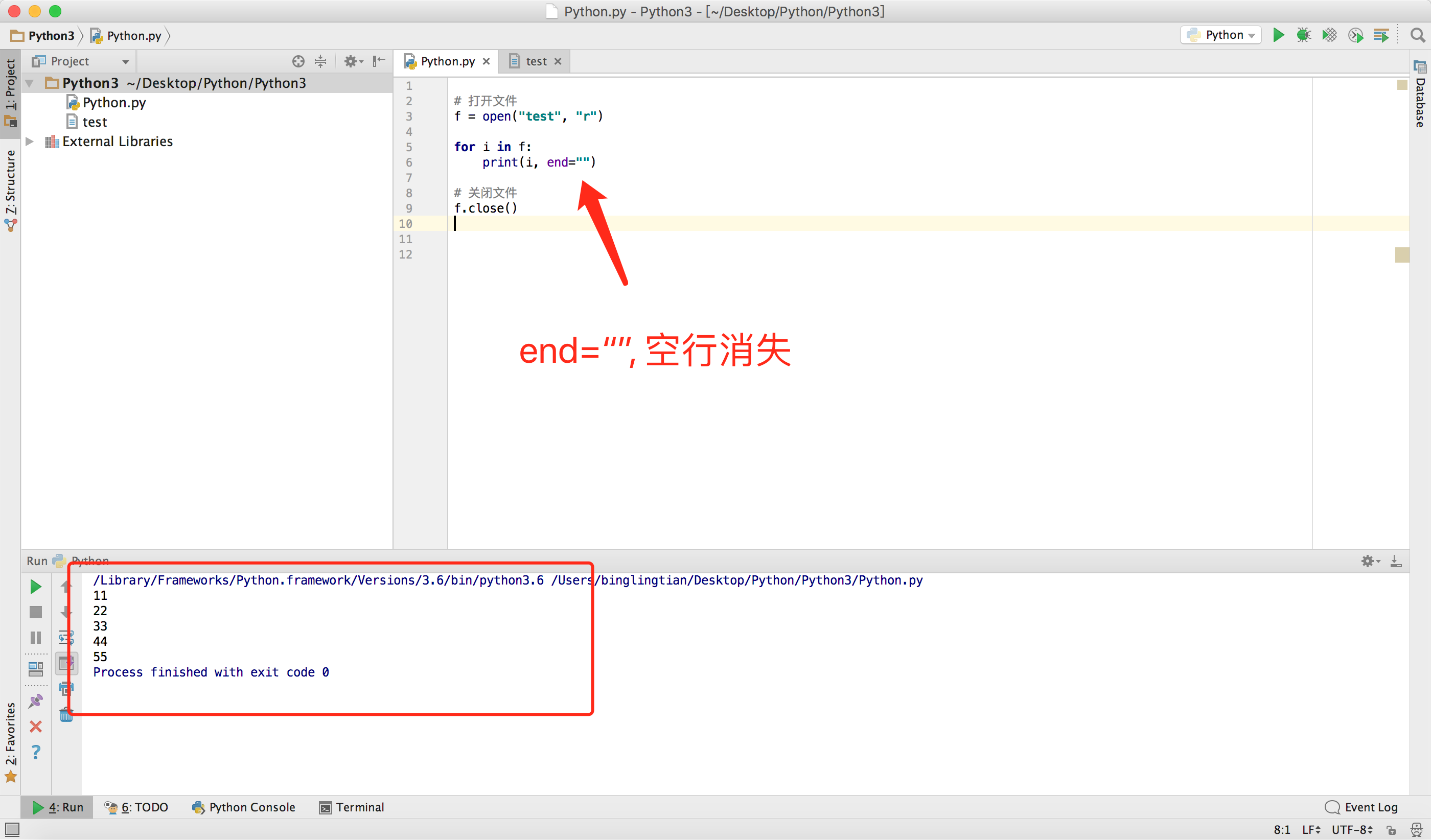 test中每一行数据后都有个\n, 再加上print()中end的默认值是\n, 所以才会显示出一个空行 -