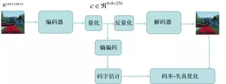 用深度学习设计的图片压缩完整框架包括 CNN 编码器、量化、反量化、CNN 解码器、熵编码、码字估计、码率 - 失真优化等几个模块。编码器的作用是将图片转换为压缩特征,解码器就是从压缩特征恢复出原始图片。其中编码器和解码器,可以用卷积、池化、非线性等模块进行设计和搭建。