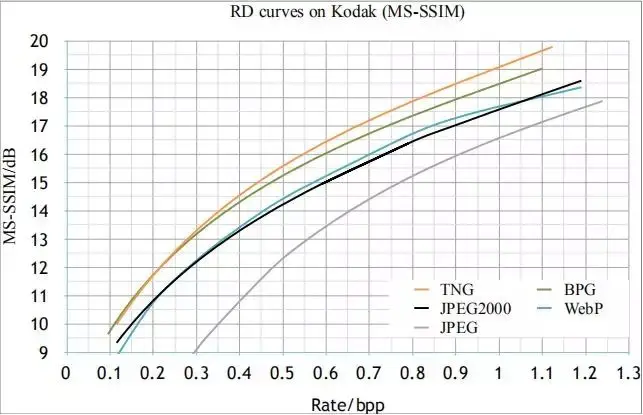 图鸭科技通过深度学习技术研发的图片压缩 TNG 在内部的测试上已经超过 webp 与 BPG,下图是在 kodak24 标准数据集上测评结果, 分别是 PSNR 值与 MS-SSIM 值。