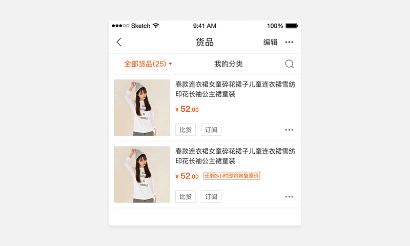 关键切入点:我们在用户第一次进入收藏夹时,加入利益点透传小黄条,比如「您收藏的货品有9件正在参与促销」,并运用「斗转星移」法,把利益点小黄条作为关键联动元素,慢慢飘逸缩小成提醒小圆点,点在全部货品栏上,提醒用户点开此处可查看9件促销商品。