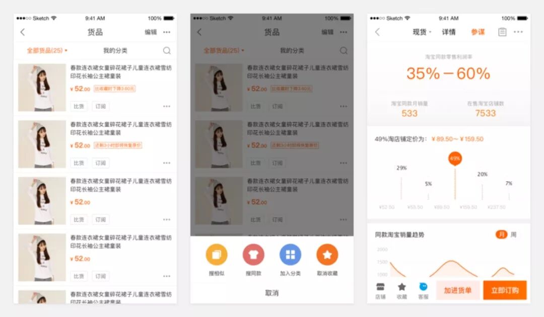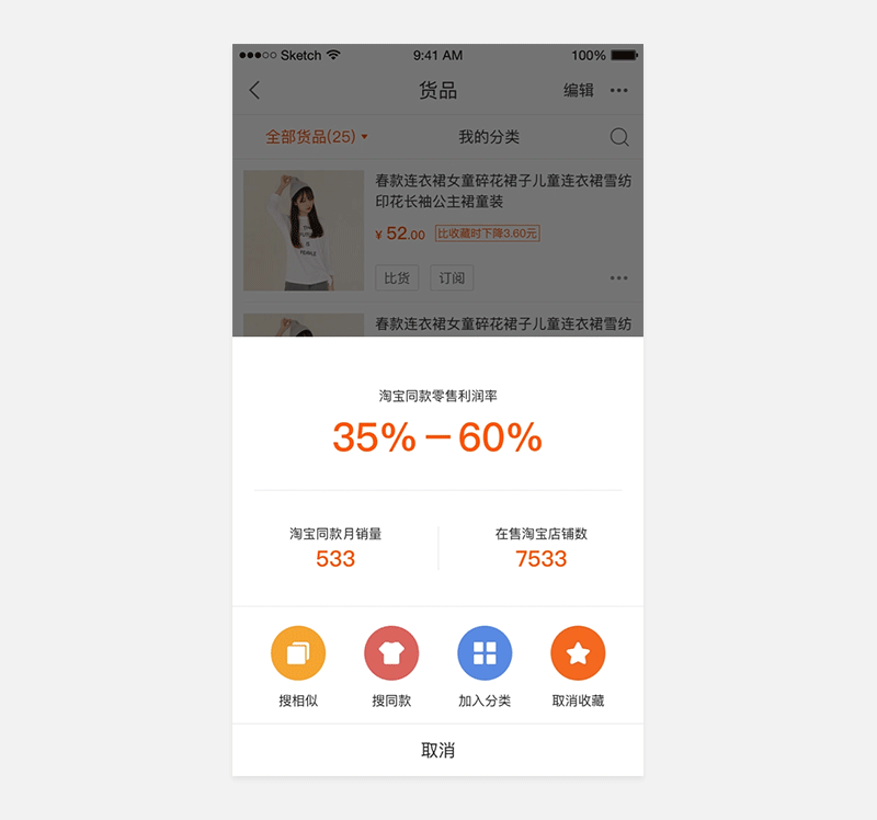 产品问题:C类用户下单是为了自用,下单多取决于感性喜好。而B类用户下单是为了销售,下单时会将产品好不好卖作为自己下单的重要决策因素。因此我们希望在收藏夹场景下,把下游销售数据前置,在买家对感兴趣的商品进行操作时,直接透传相关参谋数据,帮助B类买家更高效的进行二次下单决策。这时问题来了,商品相关下游数据很多,在商品操作半浮层页能否展示相对较多的数据呢?