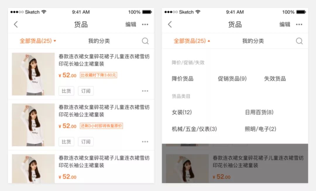 双Tab在移动端是非常影响用户操作的。为避免这种情况,我们想到,既然现货、订货、分销、拿样都是属于商品选项的,在滑动到二屏的时候,是否可以把现货、订货、分销、拿样统一收拢到顶部一级Tab的商品选项里面。