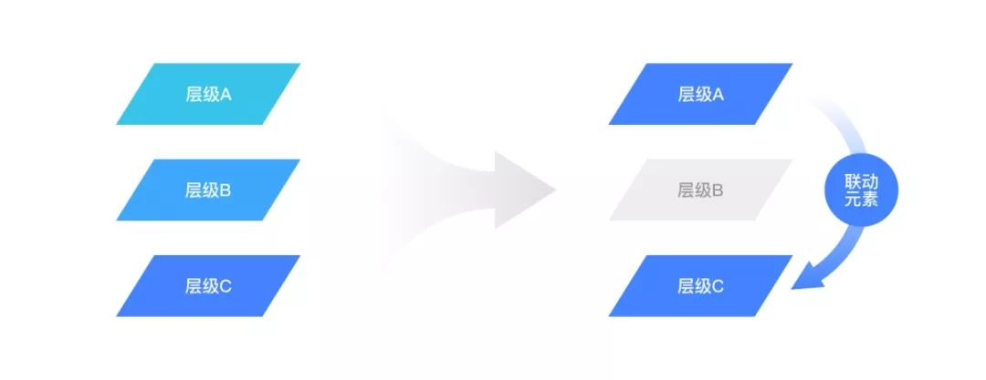 斗转星移,即以关键联动元素在各个复杂的页面层级中进行移动,引导用户视线,从而解释产品各个层级之间的关系,起到关联上下文,降低用户理解成本的作用。比如层级A、层级B、层级C,在产品定位上层级A和层级C是有关系的,但在视觉表现上ABC看起来都像是独立的个体,这时用联动元素从层级A移动到层级C,则能自然而然地向用户透传出层级A与层级C的关联性。