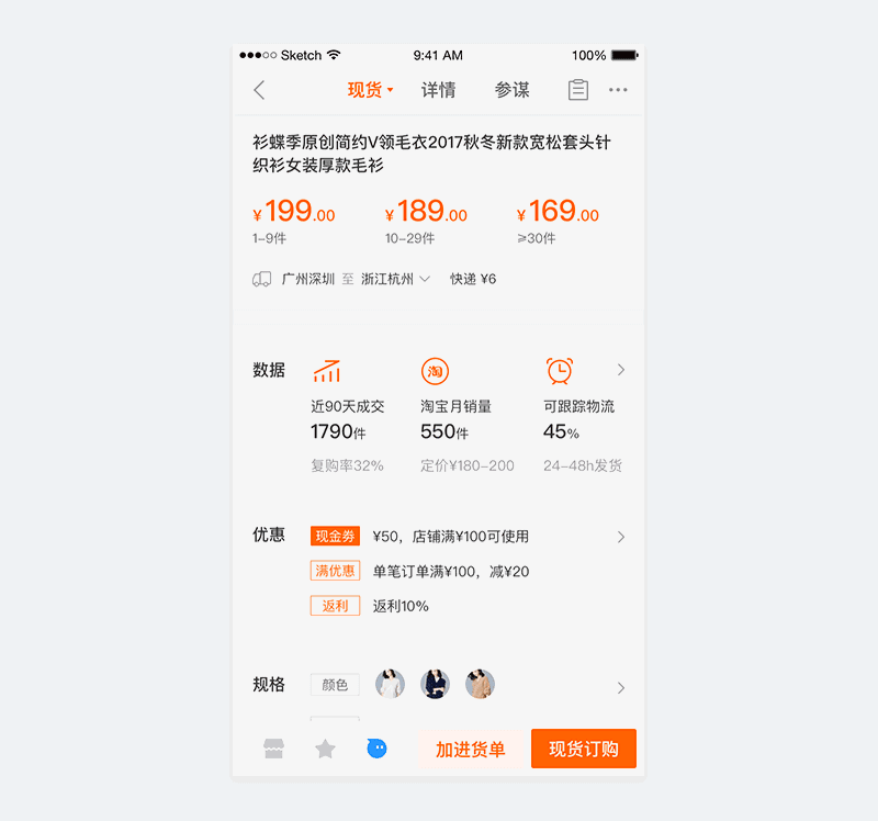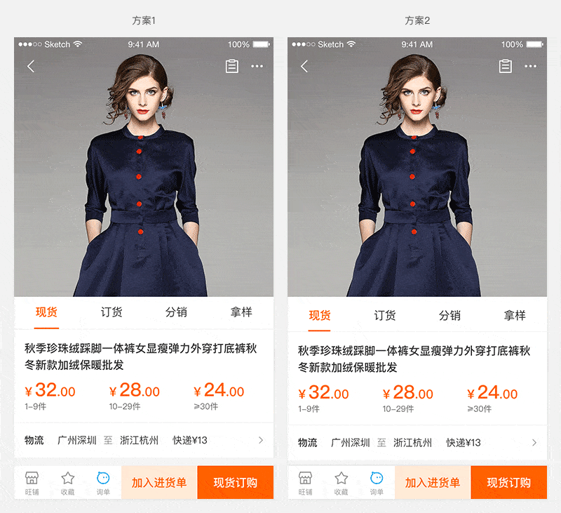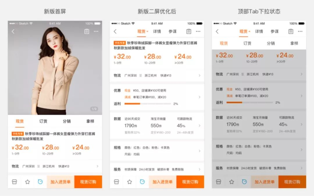 产品问题:B类Offerdetail改版,B类商品详情页较C类更加复杂。在旧版中,顶部Tab栏可切换商品、详情、参谋,分销和拿样功能放在商品页的次屏。新版Offerdetail加入了订货功能,并把分销和拿样功能一起放到了首屏。这样在首屏,便把商品拆为现货、订货、分销、拿样四个Tab。
