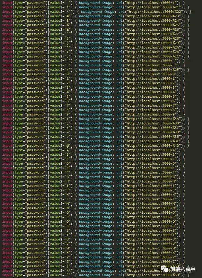 所以只要在每输入一个值都匹配,然后通过 background-image 去请求一个已经准备好的接口,就能记录用户的输入。