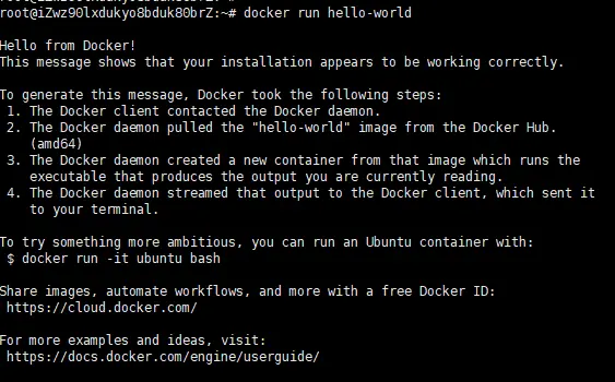 - Docker 后台进程从 Docker Hub 拉取了 hello-world 镜像。