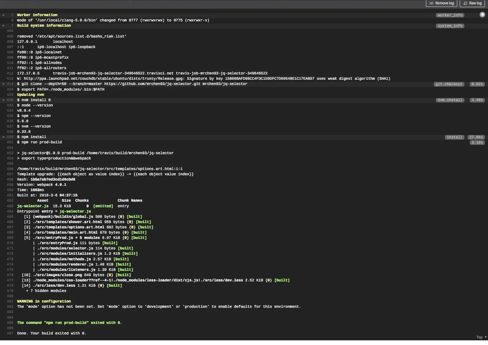 看,我们制定了node8环境,travis就先安装了node 8 。