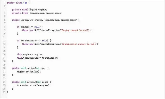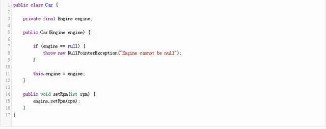 如果提供的参数是不空,没有异常和正常功能的类。 尽管这是一个简单的解决问题的办法,其缺陷突出显示多个参数时必须经过验证。 例如,如果我们提供一个Engine和一个Transmission对象的Car构造函数,我们班增加如下: