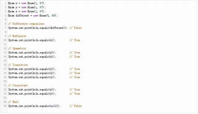 否则。 在大多数情况下,默认等于实现就足够了,但是在可能的情况下需要更多的调整实现。 例如,如果我们创建一个不可变类,这个类的两个对象应该是平等的,如果所有的字段都是平等的。 在实践中,压倒一切的equals方法结果在随后的实现结构: