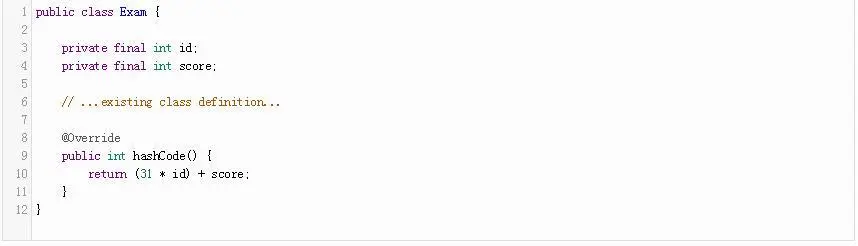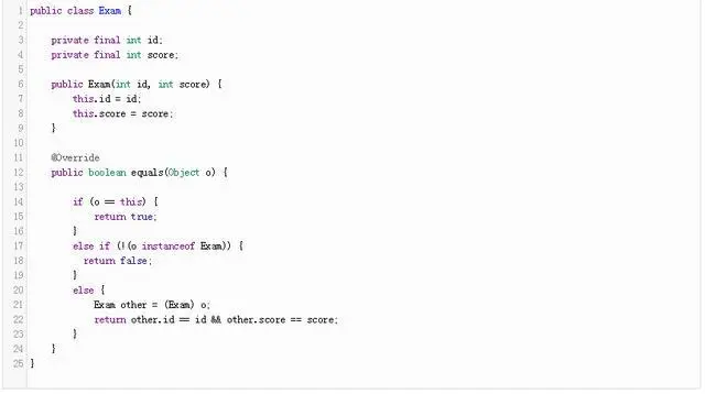 例,如果我们想要创建一个不可的Exam类,记录收到的年级学生在一个特定的考试,我们可以定义类,连同它的equals方法,如下: