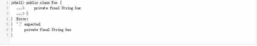 重要的是要注意,虽然我们可以执行单个语句没有后面的分号,语句的范围(即那些花括号包围,单行的条件,等等)必须包含分号。 例如,离开了后面的分号的类定义导致jshell语法错误: