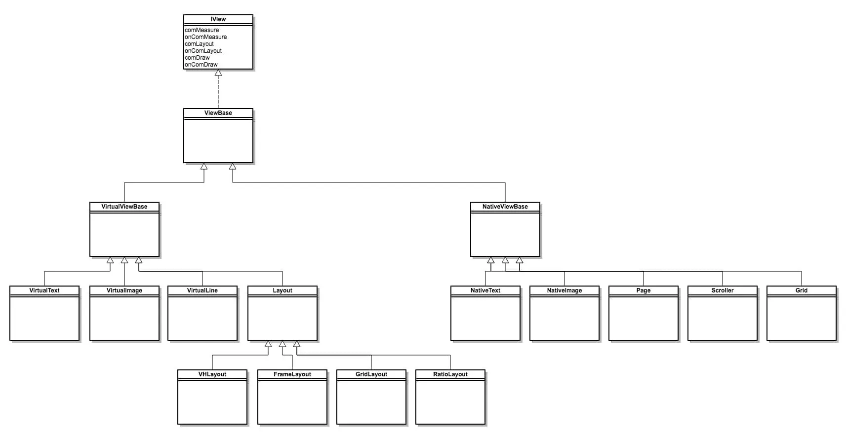 系统渲染组件的时候分别会调用这几个过程。ViewBase 定义控件的基础属性;虚拟控件都继承自 VirtualViewBase,虚拟容器控件都继承自 Layout,原生控件需要按照本 IView 的协议进行封装,这个封装成就是需要继承自 NativeViewBase;这样虚拟组件和原生组件都有共同的对外接口,当系统渲染的时候不论虚拟化控件还是原生控件都可以用通用的方式调用,为混合方式搭建业务组件提供了可能性。