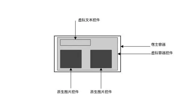 通过在宿主容器里,挂了一个虚拟容器控件、一个虚拟文本控件、两个原生图片控件,可以组合成一个复杂的业务场景下的组件,当它被最终渲染出来的时候,系统只看到宿主容器和连个原生图片组件,而且系统看到的是宿主容器下直接挂载了图片控件;如果按照常规的方法开发,这种布局结构,系统就看到了宿主容器、一层布局、一个文本、两个图片,而且总共有 3 层结构,所以本方案能通过视图结构扁平化、虚实结合的方式搭建视图。