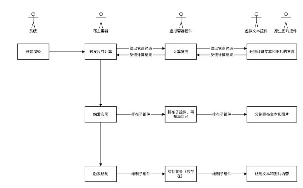 当这样一个 VirtualView 挂载到系统布局容器里的时候,系统就要对他进行测量、布局、绘制三个阶段,才能显示出来。而这三个阶段触发的入口便是宿主容器的 onMeasure,onLayout,onDraw 三个阶段。对于从 XML 里加载出来的整个组件来说,会构造一棵 ViewBase 树挂载到宿主容器里,在宿主容器的 onMeasure,onLayout,onDraw 三个阶段里调用 ViewBase 树根节点的 onComMeasure,onComLayout,onComDraw,然后再进一步递归调用子节点的这些方法,就配合系统显示流程完成了对应的逻辑。虚拟化控件的尺寸计算协议与 Android 系统的协议一致。对于原生控件来说,IView 的实现就是调用 View 的对应方法,而对于虚拟化控件来说,onComMeasure 过程与实现自定义 View 一样完成计算逻辑,而 onComLayout 过程需要根据计算结果控制子节点的布局位置或者绘制位置,而 onComDraw 阶段就是操作 canvas 对象,偏移一定位置,然后开始绘制。