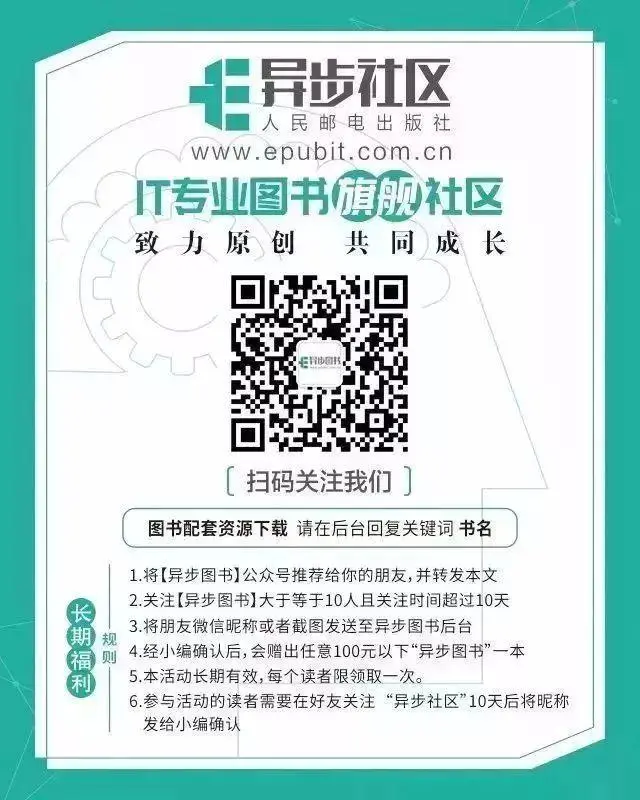 在“异步图书”后台回复“关注”,即可免费获得2000门在线视频课程;推荐朋友关注根据提示获取赠书链接,免费得异步图书一本。赶紧来参加哦!
