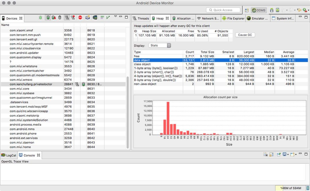 该内存检测工具位于 DDMS 下面,在 Android Studio 里面可以通过 Tools-Android-Android Device Monitor 打开,Heap Viewer 可以实时查看 App 分配的内存大小和空闲内存大小,并且发现 Memory Leaks。