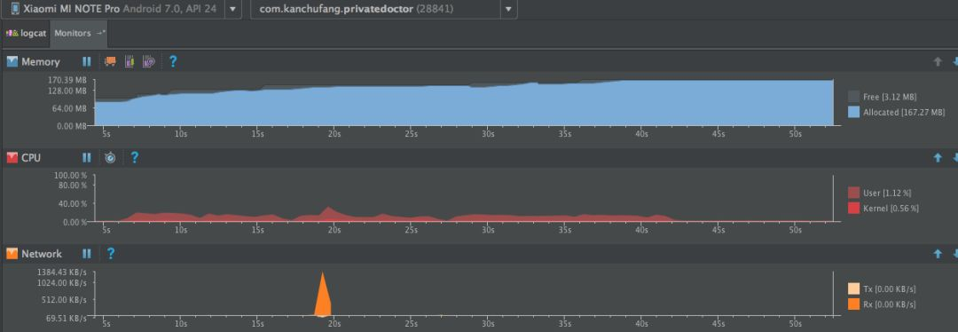 该工具位于 Android Monitor 下面,Android Monitor 是 Android Studio 自带的一个强大的性能分析工具,里面一共包含 5 个模块:Logcat、Memory、CPU、Network 及 GPU。