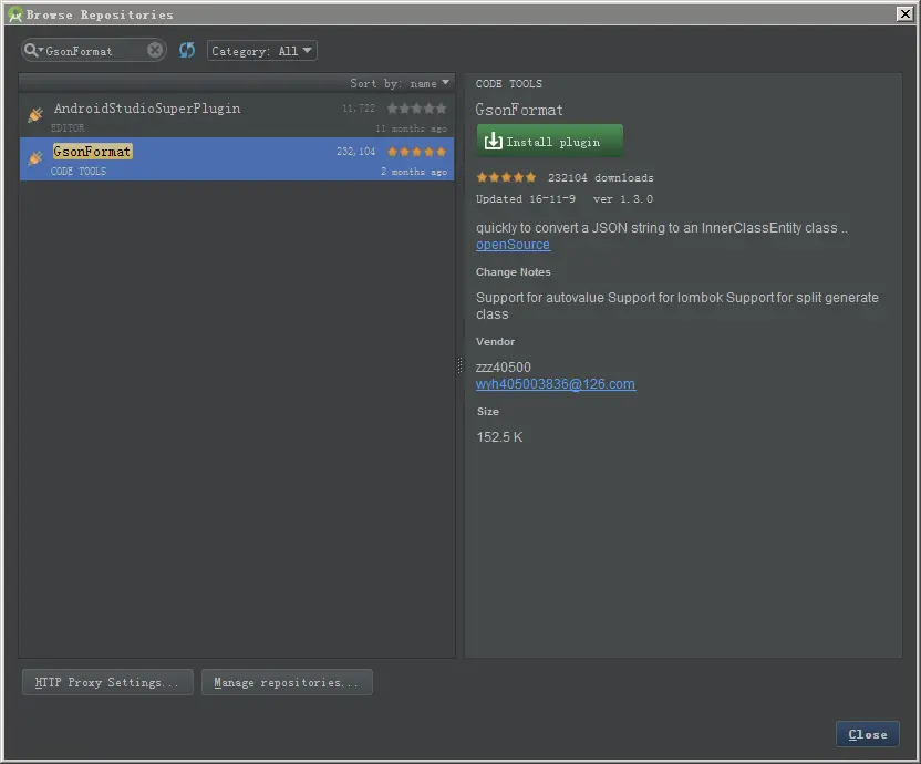 然后在新打开的窗口中搜索GsonFormat,点击右侧绿色按钮就可以下载安装了,安装完需要重启下studio,就可以用了。