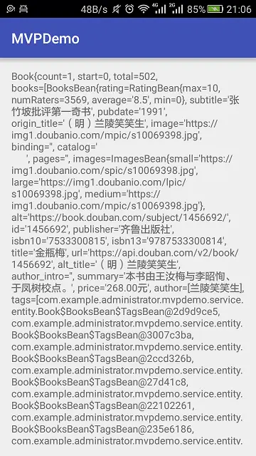 逻辑并不复杂,我们先创建了一个BookPresenter 对象,然后调用它的onCreate方法进行初始化,接着调用attachView来绑定BookView。BookView的实现也很简单,在onSuccess方法中将Book 中内容显示在TextView上,在onError中弹出一个Toast提示。然后点击按钮的时候就调用BookPresenter中getSearchBooks方法,同时传入必要的入参。这样网络请求就开始了,如果请求成功就会回调BookView 中的onSuccess方法,失败就回调onError方法。当活动销毁时记得调用BookPresenter的onStop方法来释放订阅关系,防止内存泄漏。