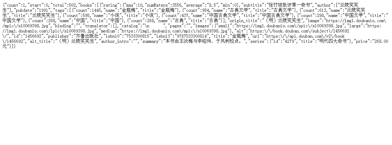 A type-safe HTTP client for Android and Java说人话就是“一个类型安全的用于Android和Java网络请求的客户端”,其实就是一个封装好的网络请求库。接下来就来看一下这个库该怎么用。首先我在网上找了一个API接口用于测试:https://api.douban.com/v2/book/search?q=金瓶梅&tag=&start=0&count=1这是一个用于查询一本书详细信息的一个请求接口。如果直接用浏览器打开的话会返回以下内容: