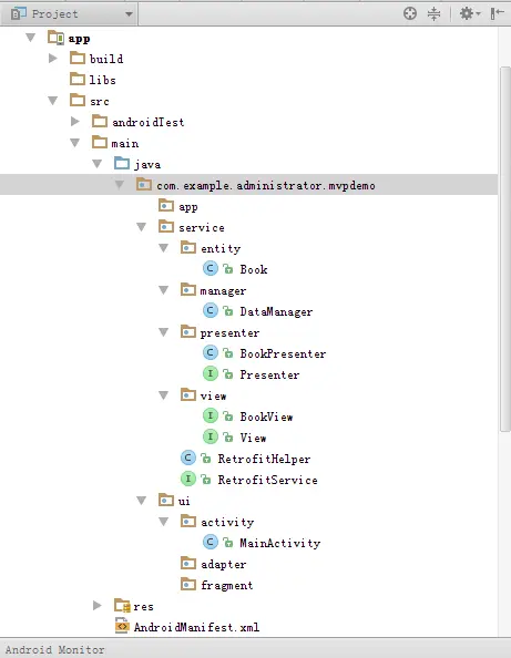 BookPresenter实现了我们定义的基础Presenter,在onCreate中我们创建了DataManager的实体类,便于调用RetrofitService中的方法,还新建了一个CompositeSubscription对象,CompositeSubscription是用来存放RxJava中的订阅关系的。注意请求完数据要及时清掉这个订阅关系,不然会发生内存泄漏。可在onStop中通过调用CompositeSubscription的unsubscribe方法来取消这个订阅关系,不过一旦调用这个方法,那么这个CompositeSubscription也就无法再用了,要想再用只能重新new一个。然后我们可以看到在attachView中,我们把BookView传进去。也就是说我们要把请求下来的实体类交给BookView来处理。接下来我们定义了一个方法getSearchBooks,名字和入参都和请求接口RetrofitService中的方法相同。这里的这个方法也就是请求的具体实现过程。其实也很简单,就是向CompositeSubscription添加一个订阅关系。上面我们已经说过manager.getSearchBooks就是调用RetrofitService的getSearchBooks方法,而这个方法返回的是一个泛型为Book的Observable,即被观察者,然后通过subscribeOn(Schedulers.io())来定义请求事件发生在io线程,然后通过observeOn(AndroidSchedulers.mainThread())来定义事件在主线程消费,即在主线程进行数据的处理,最后通过subscribe使观察者订阅它。在观察者中有三个方法:onNext、onCompleted、onError。当请求成功话,就会调用onNext,并传入请求返回的Book实体类,我们在onNext中,把请求下来的Book实体类存到内存中,当请求结束后会调用onCompleted,我们把请求下来的Book实体类交给BookView处理就可以了,如果请求失败,那么不会调用onCompleted而调用onError,这样我们可以向BookView传递错误消息。