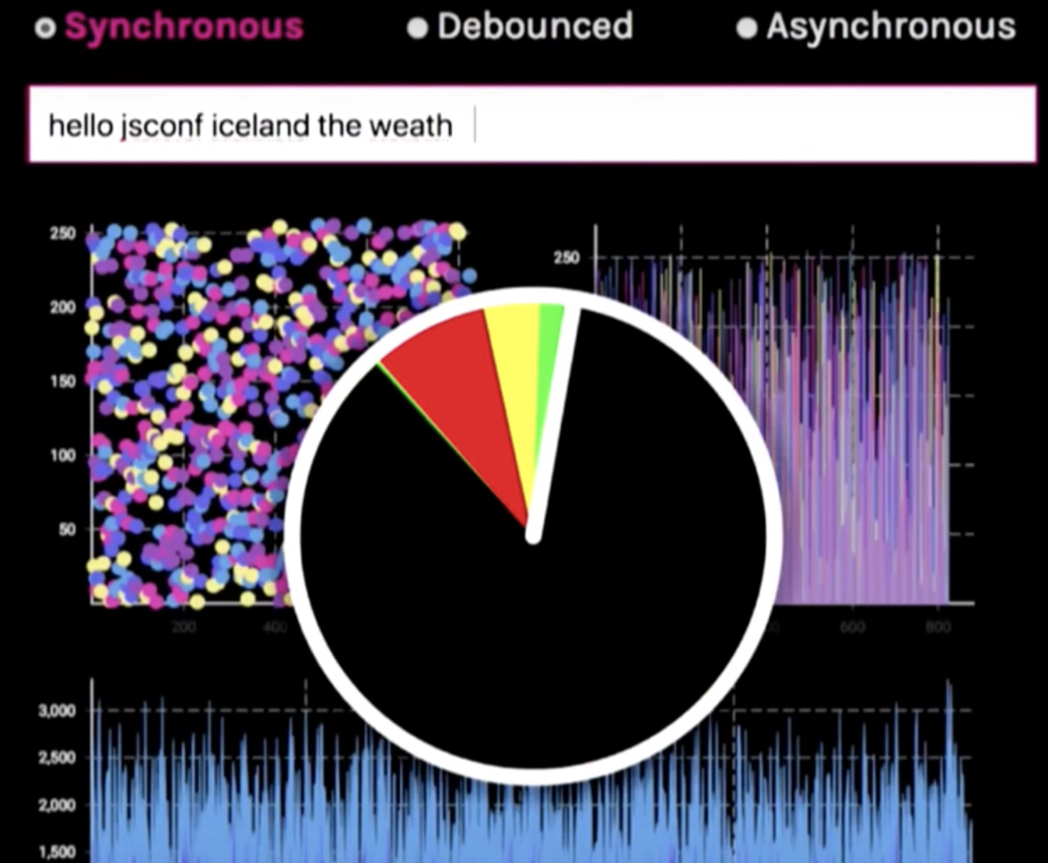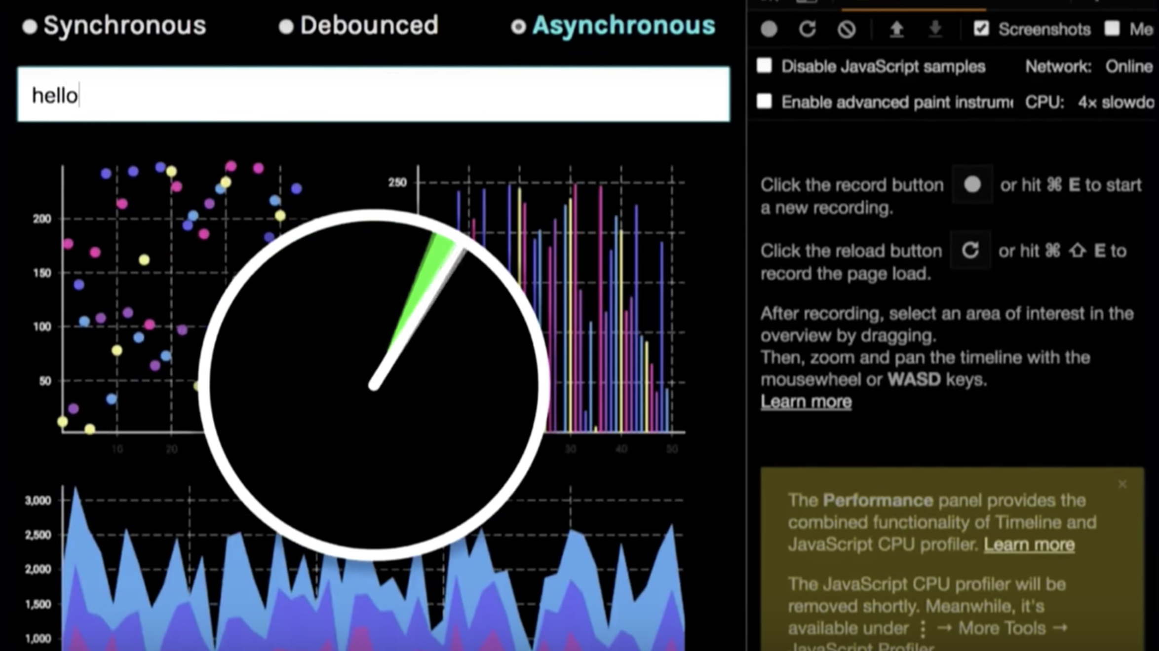从这张图可以看到,随着输入的增多,时钟出现红色,性能也越来越差。主要的问题是输入与react组件的更新是同步的,输入文字之后立即更新,性能非常差。