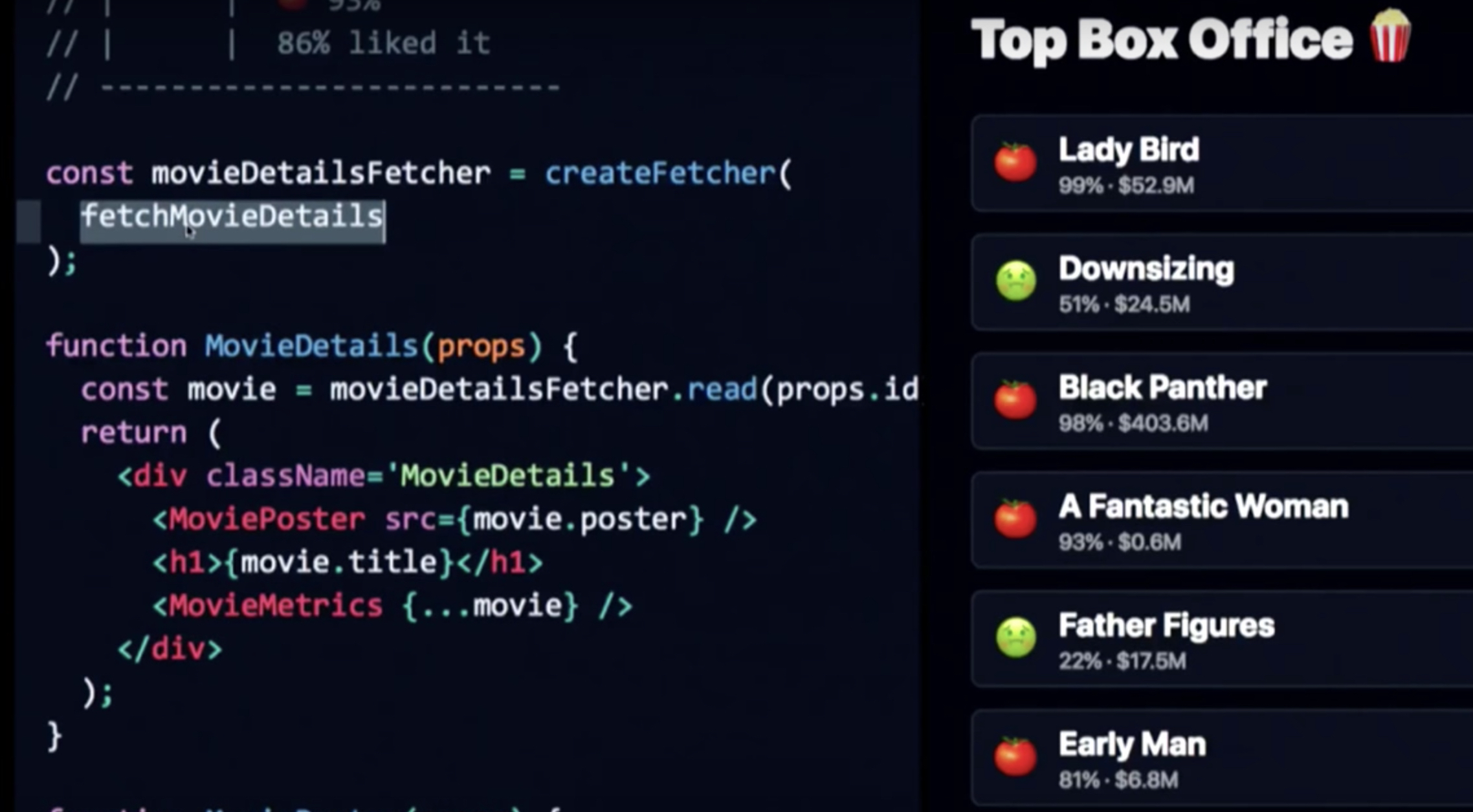 上图注意movieDetailsFetcher.read这个函数,是未来react提供的获取数据的方式,提供了一个简单的缓存,作用原理如下: