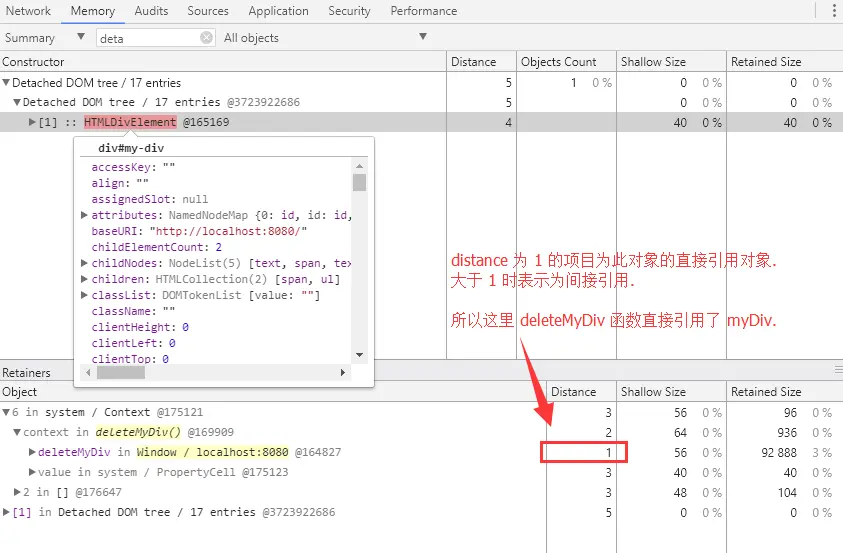 最早的代码问题出现在了,deleteMyDiv 对 myDiv 进行了引用,而且 deleteMyDiv 没有进行回收,所以导致 myDiv 的一直存在.
