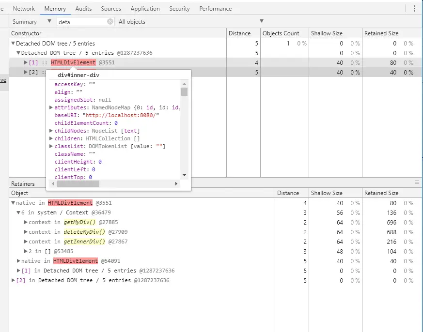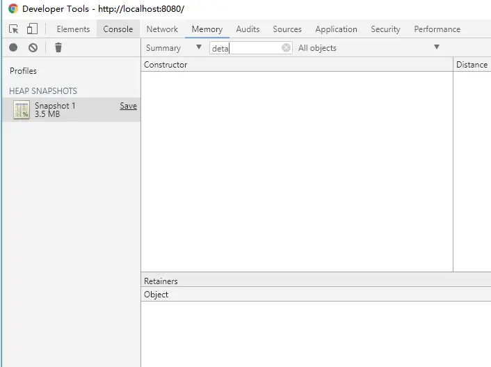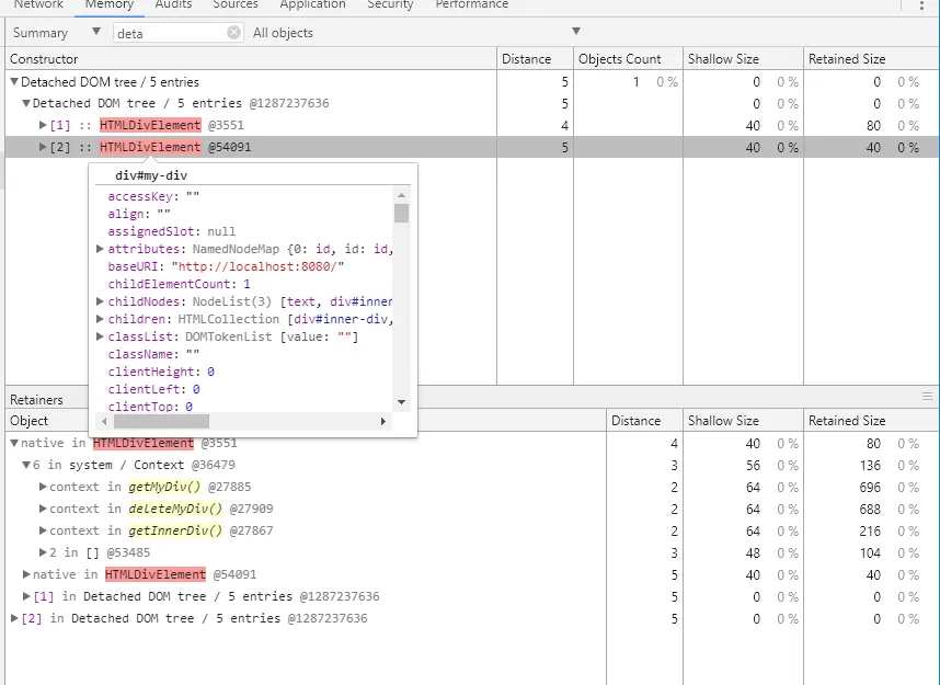 我们来用 Chrome 开发者工具中抓一下 Heap 观察一下,看看是不是能找到 Detached DOM.
