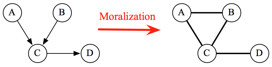不难看出,贝叶斯网络是 MRF 的特例,带有非常特定类型的团聚因子(对应于条件概率分布并且暗示图中的有向非循环结构)和归一化常数 1。 特别是,如果我们取一个有向图G,并向给定节点的所有父节点添加侧边(并消除它们的方向性),那么CPD(看做变量及其祖先的因子)可以在生成的无向图上因式分解。 由此产生的过程被称为规范化(Moralization)。