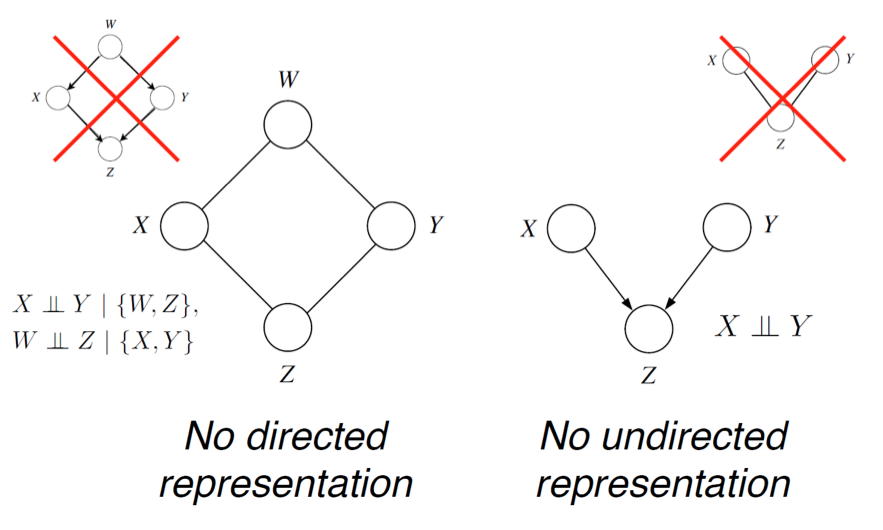 在有向的情况下,我们发现I(G)⊆I(p),但是存在分布p,其独立性不能用G来描述。在无向情况下,同样的情况也成立。 例如,考虑由有向v结构描述的概率(即 explaining away 现象)。 无向模型不能描述独立性假设X⊥Y。