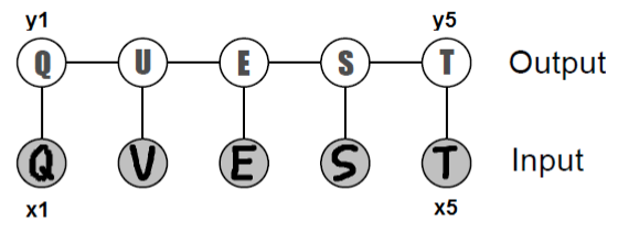 我们原则上可以训练一个分类器,从它的xi中分别预测每个yi。 然而,由于这些字母组合在一起形成一个词,所以跨越不同i的预测应该互相知道。 在上面的例子中,第二个字母本身可以是'U'或'V';然而,由于我们可以高度自信地判断其邻居是'Q'和'E',我们可以推断'U'是最可能的真实标签。