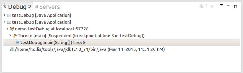 Eclipse通过Suspend与Resume来支持线程的暂挂与恢复。一般来讲,Suspend适用于多线程程序的调试,当需要查看某一个线程的堆栈帧及变量值时,我们可以通过Suspend命令将该线程暂挂。Resume用于恢复。有两种Resume需要注意:第一是当在调试过程中修改程序代码,然后保存,点击Resume,此时程序会暂挂于断点。第二是当程序抛出异常时,运行Resume,程序也会暂挂于断点。