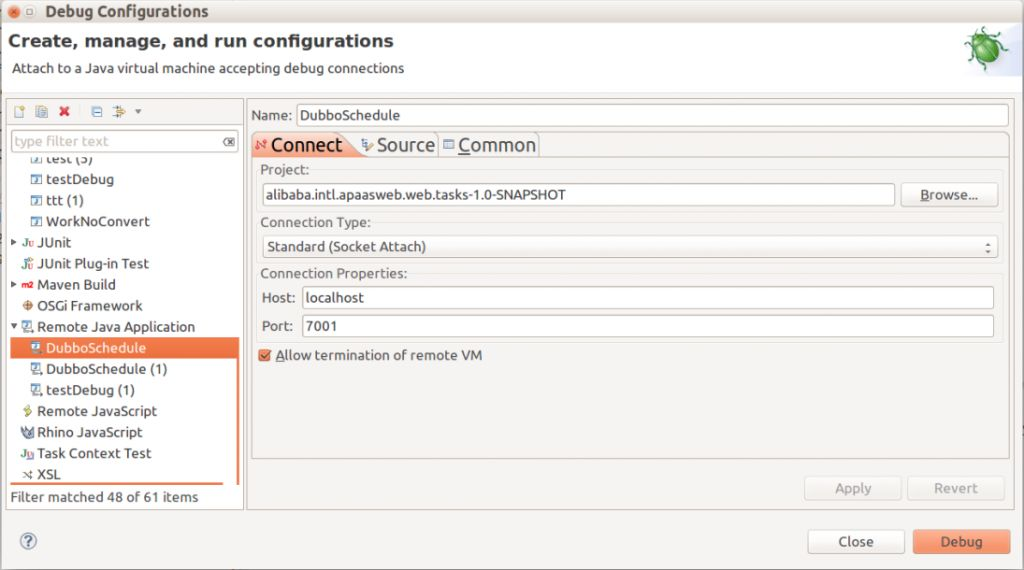 在 Connect 选项卡的 Project 字段,选择在启动搜索源代码时要引用的项目。在 Connect 选项卡的 Host 字段,输入运行 Java 程序的远程主机的 IP 地址或域名。在 Connect 选项卡的 Port 字段,输入远程 VM 接收连接的端口。通常,该端口在启动远程 VM 时指定。如果想让调试器决定在远程会话中 Terminate 命令是否可用,可以选择 Allow termination of remote VM 选项。如果希望可以终止连接的 VM,则选择该选项。现在,在选择 Debug 选项时,调试器会尝试连接到指定地址或端口的远程 VM,结果会在 Debug 视图中显示出来。
