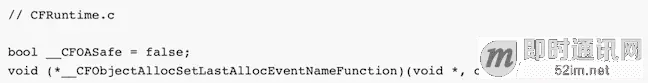 但后来发现,NSData创建对象的类静态方法没有调用+[NSObject alloc],里面实现是调用C方法NSAllocateObject来创建对象,也就是说这类方式创建的OC对象无法通过hook来获取OC类名。最后在苹果开源代码CF-1153.18找到了答案,当__CFOASafe=true并且__CFObjectAllocSetLastAllocEventNameFunction!=NULL时,CoreFoundation创建对象后通过这个函数指针告诉上层当前对象是什么类型: