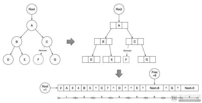 传统二叉树是用链表方式实现,每次添加/删除结点,都会申请/释放内存。为了减少内存操作,可以用数组实现二叉树。具体做法是父结点的左右孩子由以往的指针类型改成整数类型,代表孩子在数组的下标;删除结点时,被删除的结点存放上一个被释放的结点所在数组下标。
