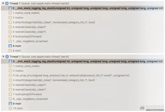 当malloc_logger和__syscall_logger函数指针不为空时,malloc/free、vm_allocate/vm_deallocate等内存分配/释放通过这两个指针通知上层,这也是内存调试工具malloc stack的实现原理。有了这两个函数指针,我们很容易记录当前存活对象的内存分配信息(包括分配大小和分配堆栈)。分配堆栈可以用backtrace函数捕获,但捕获到的地址是虚拟内存地址,不能从符号表dsym解析符号。所以还要记录每个image加载时的偏移slide,这样符号表地址=堆栈地址-slide。