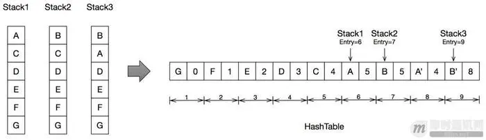 为此,可以用Hash Table来存储这些堆栈。思路是整个堆栈以链表的方式插入到table里,链表结点存放当前地址和上一个地址所在table的索引。每插入一个地址,先计算它的hash值,作为在table的索引,如果索引对应的slot没有存储数据,就记录这个链表结点;如果有存储数据,并且数据跟链表结点一致,hash命中,继续处理下一个地址;数据不一致,意味着hash冲突,需要重新计算hash值,直到满足存储条件。举个例子(简化了hash计算):