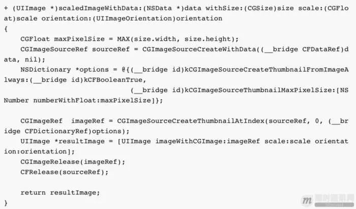 但处理大分辨率图片时,往往容易出现OOM,原因是-[UIImage drawInRect:]在绘制时,先解码图片,再生成原始分辨率大小的bitmap,这是很耗内存的。解决方法是使用更低层的ImageIO接口,避免中间bitmap产生: