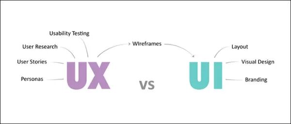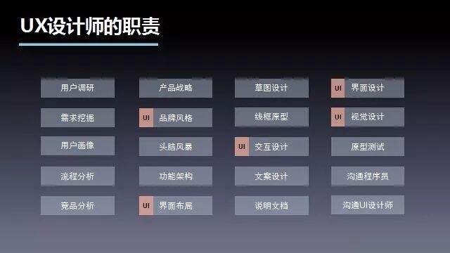 从这张图中我们可以看到:UI呢,重点是在布局设计、视觉设计和品牌的形象;而UX呢,包括了用户研究、故事、用户画像和可用性测试等等内容,它们之间有相通的地方,比如,线框原型、交互设计、界面设计等等方面。