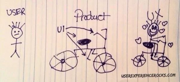 你要造一辆自行车,你的自行车造出来是什么样子的,即什么颜色的?车座子、车轮子、车把等等这些的形状、构造等等是什么样子的,都成为UI,也就是外观;那么用户购买了你的自行车,肯定是用来骑行的。在骑行的时候,是否舒服?车速、加速怎样?对外观是不是喜欢等等,这些就是UX,即用户体验了。