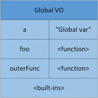 当JavaScript代码运行中,如果试图寻找一个变量的时候,就会首先查找VO。对于前面例子中的代码,Global Execution Context中的VO就可以表示如下: