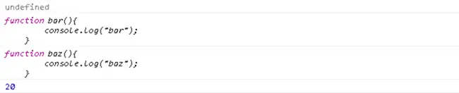 代码中,最"奇怪"的地方应该就是"bar"的输出了,第一次是一个函数,第二次是"20"。