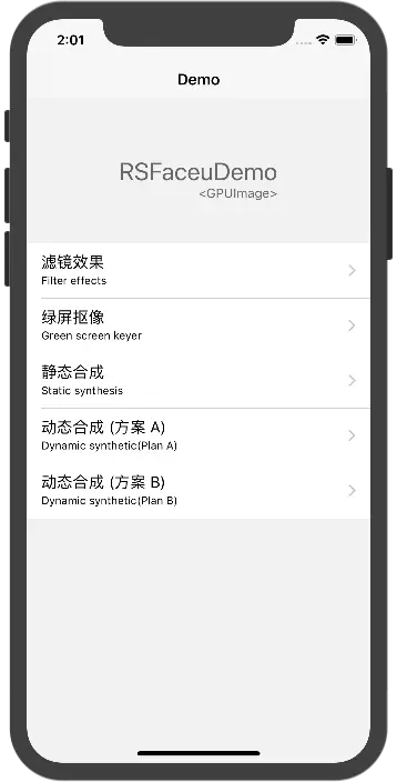 | 1.列表页 | 2.滤镜效果页 | 3.绿屏抠像页 | 4.静态合成页 |
