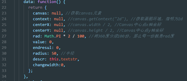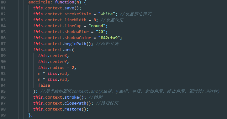 this.context.arc( this.centerX, this.centerY, this.radius - 2, n * this.rad, n * this.rad, false ); //用于绘制圆弧context.arc(x坐标,y坐标,半径,起始角度,终止角度,顺时针/逆时针) this.context.stroke(); //绘制 this.context.closePath(); //路径结束 this.context.restore(); }, blueCircle: function(n) { this.context.save(); this.context.strokeStyle = "#42cfa9"; //设置描边样式 this.context.lineWidth = 2; //设置线宽 this.context.lineCap = "round"; this.context.shadowBlur = "9"; this.context.shadowColor = "#42cfa9"; this.context.beginPath(); //路径开始 this.context.arc( this.centerX, this.centerY, this.radius - 2, 0, n * this.rad, false ); //用于绘制圆弧context.arc(x坐标,y坐标,半径,起始角度,终止角度,顺时针/逆时针) this.context.stroke(); //绘制 this.context.closePath(); //路径结束 this.context.restore(); }, //绘制外圈 whiteCircle: function() { this.context.save(); this.context.beginPath(); this.context.strokeStyle = "#25363F"; this.context.arc( this.centerX, this.centerY, this.radius - 2, 0, Math.PI * 2, true ); this.context.stroke(); this.context.closePath(); this.context.restore(); }, }); Vue.component("ring-percent", result); // register to be used // return to be used in unit tests return result;});</script>请原谅我用markdown写的代码不换行,这里粘贴一下代码图片,看起来会舒服一些