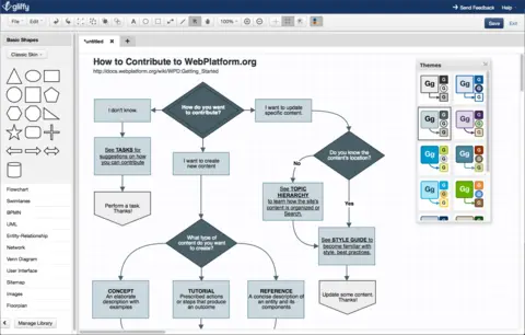 Gliffy 也是一个基于Web的在线作图应用,它可以帮助用户创建流程图、组织结构图、平面图、业务流程、网络图、技术图、线框图等等。跟上面的两款工具也是非常类似,Gliffy的基础版本免费。不过其在线制作的思维导图是公开的,高级版本有设置隐私权的权力。用户可以将其可以嵌入博客,办公室应用软件中,有很好的兼容性。通过Gliffy编辑的流程图图片可输出SVG、GPEG格式。