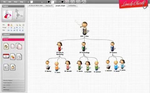 Lovelycharts 提供功能强大的在线图表制作,Lovelycharts提供便捷的制作过程,主要有两大功能:Drag/Drop和Create/Connect。Drag/Drop 提供用户从各大系列备用元素库中选用图标,并在区域内拖拉至合适位置;Create/Connect 提供用户用箭头、线条等组建个元素间的关系,完成图表。